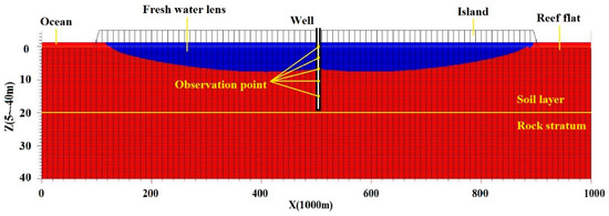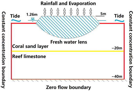 Numerical simulation was performed to investigate the impact of precipitation and tides on the freshwater lens, as well as the impact of the minimum boundary time scale on the simulated properties of the freshwater lens. Given that this study was focused on tides, precipitation, and time scales, the impact of the strata was ignored. Accordingly, the classic binary geological structure of islands was adopted in this study. Previous drilling results showed that the interface in the binary structure was at an elevation of −20 m [22,23,24]. A conceptual diagram is shown in Figure 4. The raised part in the middle was a coral island above sea level, and the low-lying parts on both sides of the island were reef flats.