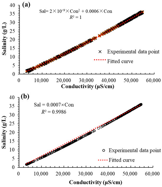 Two commonly used parameters to characterize groundwater quality of coral islands are conductivity and salinity. To facilitate data analysis, two mathematical relationships between the observed conductivity and salinity were comparatively established (Figure 7). The quadratic relationship (Figure 7a) has a goodness-of-fit (R2) of 1, and thus, such a relationship can be used for conversion between conductivity and salinity. The linear relationship (Figure 7b) has an R2 of 0.9986. Despite its relatively lower R2, the linear relationship is mathematically simple and can be used as a rapid, on-site conversion tool.