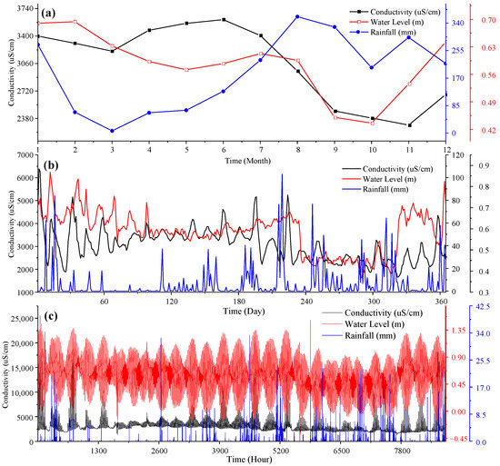 Conductivity, precipitation, and tidal level curves at the three time scales: (a) monthly scale; (b) daily scale; (c) hourly scale.