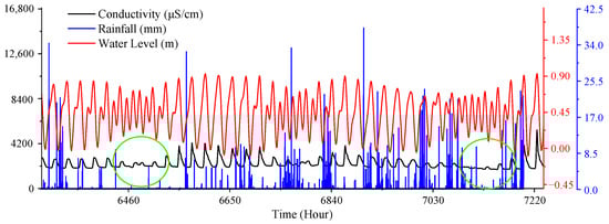 In Figure 8, panels (a), (b), and (c) refer to the monthly, daily, and hourly scales, respectively. As shown in Figure 8, the monthly scale more clearly reveals the overall trends of conductivity, precipitation, and tidal level than the daily and hourly scales. That is, the conductivity and water quality at a fixed site on the coral island vary in the same direction as precipitation and the tidal level, indicating a general synchronization between conductivity, precipitation, and tidal level. As shown by the hourly series (Figure 8c), the conductivity shows a periodic fluctuation pattern resembling a normal distribution and is basically synchronized with the tidal level, indicating that the tidal level affects the period of fluctuation of groundwater conductivity. The plotted hourly series from 6297.6 h to 7237.4 h are shown in detail in Figure 9. The two green circles indicate the hours in which the precipitation is low and the peak conductivity is low; in contrast, the peak conductivity is high at the hours in which the precipitation is high and concentrated. This indicates that the precipitation affects the peak value of groundwater conductivity at the hourly scale. In Figure 8b, the overall trends of conductivity, precipitation, and tidal level can be observed, and there is a certain degree of periodic fluctuation in the data, but the trends and fluctuation patterns are less clear than those in Figure 8a,c. To more clearly compare the variation patterns in conductivity at the three time scales, the three time series of conductivity were plotted together (Figure 10).