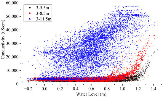 Scatter plots of conductivity versus water level at different depths.