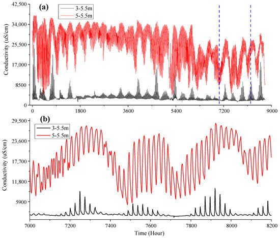 Figure 12 presents the hourly series of conductivity at the depth of 5.5 m in the ZSD-3 and ZSD-5 boreholes of the coral reef island from January to December 2018, with panel (a) partially zoomed-in and shown as panel (b). The figure indicates that groundwater conductivity is larger in the ZSD-5 borehole than in the ZSD-3 borehole, and the conductivity fluctuation patterns of the two holes are different, that is, the conductivity fluctuation pattern of the ZSD-5 borehole is more similar to that of the tidal level. This observation suggests that on a coral island, the closer to the shoreline, the higher the groundwater chloride concentration, and the greater the impact of tides on the groundwater chloride concentration.