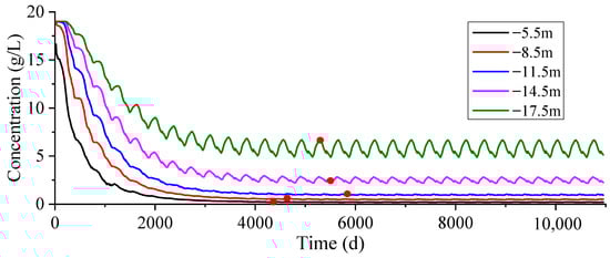 Figure 13 demonstrates the simulation result of group d (focused on monthly changes in precipitation and tides), in which the blue area is a steady-state freshwater lens, and the boundary chloride concentration of the lens was set to 1 g/L. An observation borehole was drilled in the center of the island, and borehole observation points were separately set at depths of 5.5 m, 8.5 m, 11.5 m, 14.5 m, and 17.5 m below the ground surface. Figure 14 demonstrates the daily series of the groundwater chloride concentration at each observation point during the whole simulation period, where the red dots represent the time points when the groundwater chloride concentration begins to stabilize, with the latest time point considered as the stabilization time point of the freshwater lens. The same procedure applies to the other experimental groups.