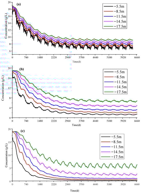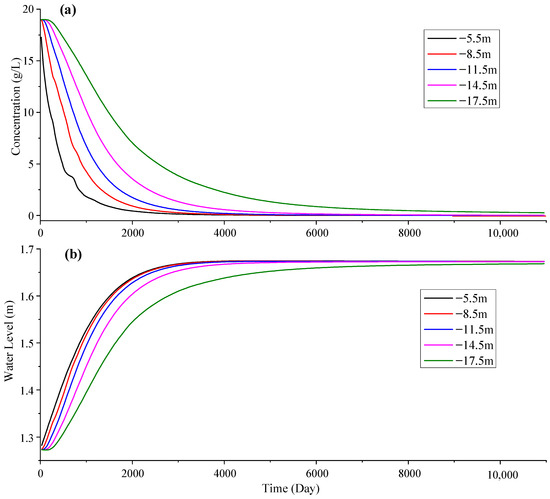 Comparison of Figure 16a and Figure 17a with Figure 18a reveals that the curve shape of Figure 16a basically coincides with that of Figure 18a, while the curve shape of Figure 17a is relatively similar to that of Figure 15a. This observation indicates that during the formation of a freshwater lens, precipitation plays a dominant role in affecting groundwater chloride content, whereas changes in the tidal level have little effect on the desalination of groundwater in coral islands. Comparing Figure 16b and Figure 17b with Figure 18b reveals that the curve shape of Figure 17b basically coincides with that Figure 18b. This indicates that during the formation of a freshwater lens, the tidal level mainly affects the hydraulic head pressure at various points in the groundwater aquifer. The above results suggest that there is a remarkable difference between the effects of rainfall and tides on the freshwater lens [29], which is mainly manifested by the fact that rainfall directly introduces freshwater into the groundwater system through infiltration and dilutes salts, thereby significantly influencing the concentration of the groundwater. However, tides have a short fluctuation period, salt transport is controlled by dispersion, and the response time is extended, which makes it difficult for tides to alter the salt distribution of groundwater significantly; yet, because the density of seawater is higher than that of freshwater, tidal fluctuation directly affects the hydraulic gradient between seawater and groundwater, which in turn significantly affects the head pressure of groundwater.