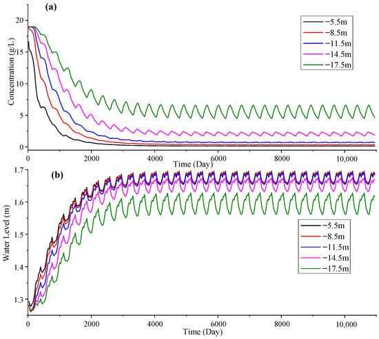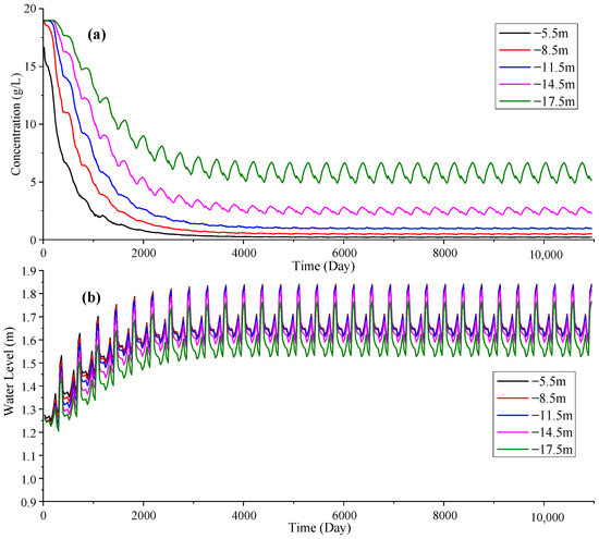 Daily series of the simulated chloride concentration and water level of group a (temporally invariant precipitation and tides): (a) chloride concentration; (b) water level.