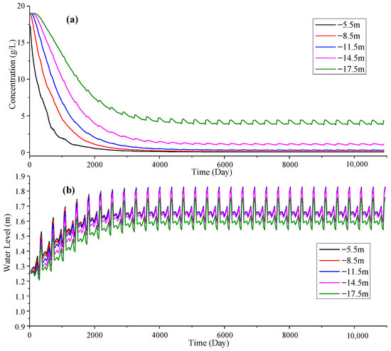Daily series of the simulated chloride concentration and water level of group b (temporally variant precipitation with temporally invariant tides): (a) chloride concentration; (b) water level.