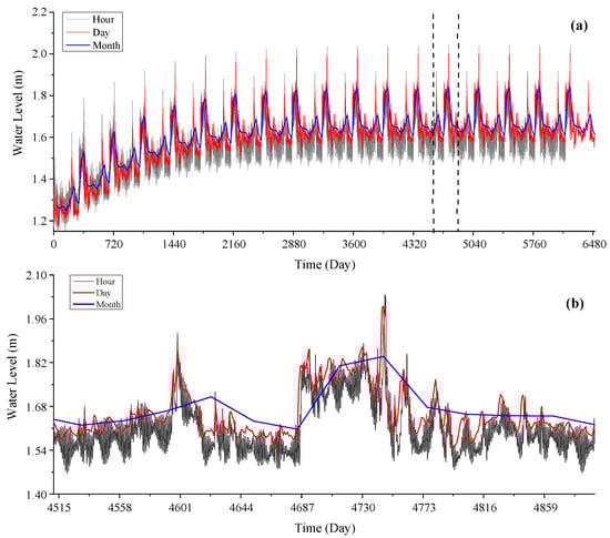 Time series of the simulated water level of groups d, e, and f: (a) the three time scales; (b) partially zoomed-in view of (a).