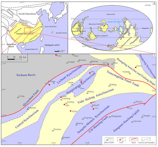 Regional tectonic location map of the study area. (a) Current tectonic architecture of South China Block (the red box indicates the location of the study area); (b) global paleogeographic map of the late Ordovician; (c) regional tectonic map of Western Hunan–Hubei Area.