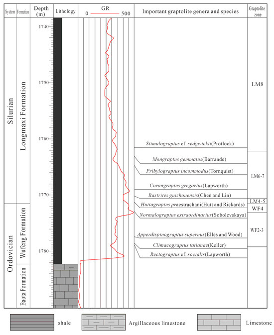 In the biostratigraphic studies of Ordovician and Silurian, graptolite is globally recognized as the dominant phylum. Although the time span of each graptolite zone from the Upper Ordovician Wufeng Formation to the Lower Silurian Longmaxi Formation is short, there is a significant difference in the diversity and abundance of the graptolite faunas they represent [9]. Therefore, using graptolite zone sequences as the division and correlation standard for black shale is the most fundamental task in the current study of Ordovician and Silurian [9]. Through a fine study of the black graptolite-bearing strata of the Wufeng Formation and the Longmaxi Formation in the Yangtze region, and referring to the internationally accepted graptolite zones, Chen Xu et al. (2015) proposed the classification criteria for the shale graptolite zones of the Wufeng Formation and Longmaxi Formation [9]. These criteria are regarded as the current standard for the stratigraphic division and correlation of these formations and have been adopted as the standard for graptolite division and correlation of the black shale in the Wufeng Formation–Longmaxi Formation of the Yangtze region.