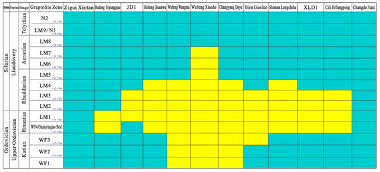 Comparison of the sequence of shale graptolite in Wufeng Formation and Longmaxi Formation of outcrop section and well in the western region of Hubei and Hunan (Note: Yellow indicates formation missing). Remarks: The isotopic age values of the base boundaries of each zone are from Gradstein et al. (2012) [24].
