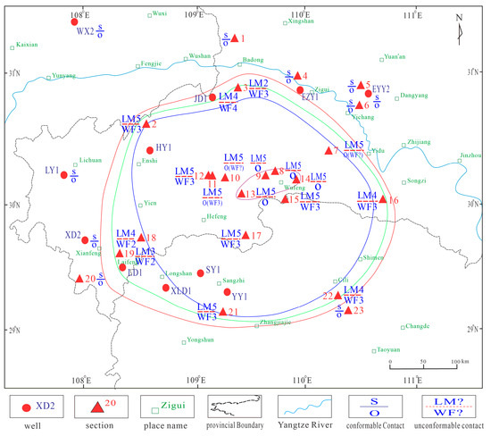 The outcrop points and drilling data across the boundary between the Ordovician and the Silurian in the Western Hunan–Hubei region show that there is a common sedimentary hiatus between the black shales of the Wufeng Formation and Longmaxi Formation in the areas such as Taiyanghe in Enshi, Wantan in Wufeng, Hubei and Longchihe in Shimen, Hunan [25,26,27,28]. Mr. Sun Yunzhu first called this sedimentary hiatus “Yichang Uplift” [27]. Affected by the “Yichang Uplift”, the Xiang-E submarine uplift was developed at the border of Hubei and Hunan [15,16]. By comparing the shale graptolite sequences of the Wufeng Formation and Longmaxi Formation (Figure 4), the distribution range of the Xiang-E submarine uplifts at the Ordovician–Silurian transition (Katian Age to Rhuddanian Age) can be roughly delineated (Figure 5). Among them, the purple line delimits an area where the Wufeng Formation is generally missing, and the LM5 zone and above directly cover the Ordovician Baota Formation. It reflects the range of the submarine uplifts during the early sedimentation of the Wufeng Formation (WF1-WF3 zone sedimentation period); the green line delimits an area where the LM4 zone and above directly cover the WF3 zone, and the WF4-LM3 zone strata are generally missing. It reflects the range of the submarine uplifts in the early Hirnantian Age (WF4 zone sedimentation period); the red line delimits an area where the Guanyinqiao Bed-LM2 zone strata are generally missing, and the Silurian Longmaxi Formation LM3 zone and above directly cover the WF3 zone. It reflects the range of the submarine uplifts during the middle–late Hirnantian Age to the early Rhuddanian Age (Guanyinqiao Bed-LM2 zone sedimentation period); the blue line delimits an area where the WF4-LM4 zone strata are generally missing, and the LM5 zone and above directly cover the WF3 zone. It reflects the range of the submarine uplifts in the middle Rhuddanian Age (LM3-LM4 zone sedimentation period).