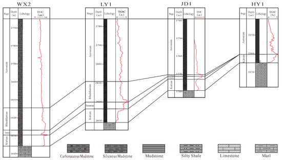 Across profile of the upper Ordovician Wufeng Formation–Lower Silurian Longmaxi Formation of wells WX2-LY1-JD1-HY1 in western Hubei and northeastern Chongqing.