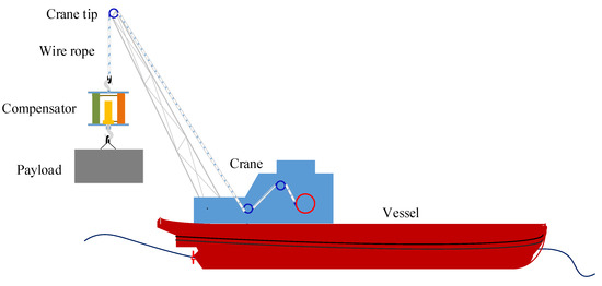 The schematic diagram of a typical offshore crane system with a passive heave compensator is shown in Figure 1. The payload is lifted or lowered in the air. It is assumed that the crane is located on the crane vessel centerline and longitudinal center of gravity for minimal vessel motion. Due to wave disturbance, the vessel will experience surge, sway, heave, roll, pitch and yaw. Only the heave motion is considered in this paper, due to the central placement of the crane. The motion response of the payload is affected by the crane tip motion. The passive heave compensator is mounted in-line between the crane hook and the payload, which is used to reduce the payload motion and dynamic tension of the wire rope due to the crane tip motion in harsh sea.
