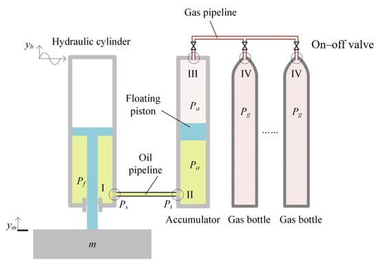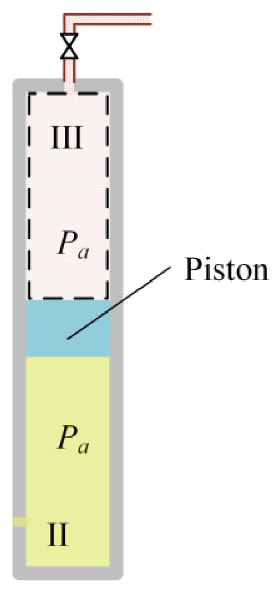 Figure 3 shows a sketch of a variable volume chamber of the piston accumulator. In the piston accumulator, the fluid chamber II is connected to the hydraulic cylinder, and the gas chamber III is connected to gas bottles by parallel pipelines. The dashed line contains the variable volume of gas considered in this section.