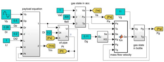 In this section, numerical simulations using the proposed mathematical model of the passive heave compensator involving Equations (1)–(4), (6)–(11) are carried out in Matlab/Simulink to obtain further insight into the influence of the main design parameters on the dynamic response of the passive heave compensator. The simulation block diagram of the proposed model is shown in Figure 4. The time range of each simulation is 10,000 s. And, the ordinary differential equation function solver ODE45 is used.