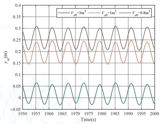 The simulation results are shown in Figure 5. The parameters are m = 250,000 kg, Va0 + Vg = 12 m3, Dp = 0.5 m, Dr = 0.28 m, Dt = 0.2 m, Lt = 1 m, and Dg = 0.1 m, where Va0 is the initial gas volume in the piston accumulator. From this figure, the relationship can be described as follows. When Vas = 3 m3, the payload oscillates about the static equilibrium position. However, when Vas = 1 m3 and Vas = 0.8 m3, the payload oscillates about the new equilibrium positions, which are slightly higher than the static equilibrium position. It can be concluded that as the accumulator volume decreases, the oscillation center moves up relative to the static equilibrium position since the passive heave compensator exhibits stronger nonlinearity.