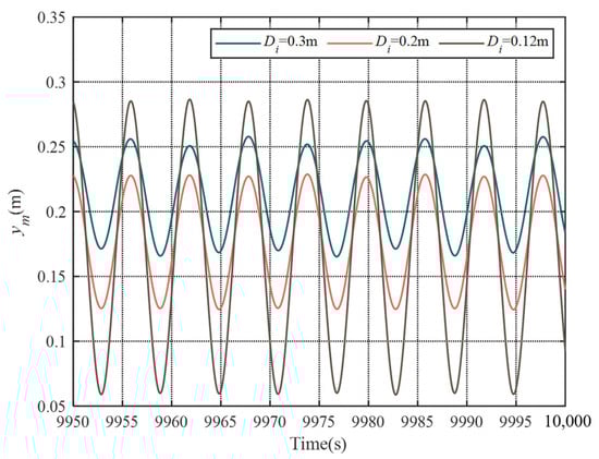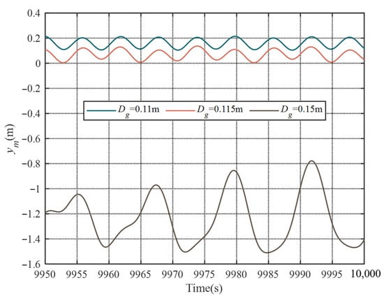 The simulation results for the diameter of the oil pipeline 0.3 m, 0.2 m and 0.12 m are shown in Figure 6. The parameters are m = 250,000 kg, Va0 = 1 m3, Vg = 11 m3, Dp = 0.5 m, Dr = 0.28 m, Dt = 1 m, Dg = 0.1 m and Lt = 1 m. It may be seen that, by increasing the diameter of the oil pipeline, a substantial increase in the compensation efficiency can be achieved. It is to be noted that the diameter of the oil pipeline also has an effect on the position of the oscillation center of the payload. With an increasing the diameter of the pipeline, the oscillation center of the payload moves up.