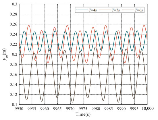 The payload displacement is plotted in Figure 8 for three different excitation periods of 4 s, 5 s and 6 s. The parameters are m = 250,000 kg, Va0 = 1 m3, Vg = 11 m3, Dp = 0.5 m, Dr = 0.28 m, Dt = 0.2 m, Lt = 1 m, and Dg = 0.11 m. Figure 7 demonstrates that decreasing the excitation period reduces payload displacements. This phenomenon occurs because shorter excitation periods increase the dynamic force magnitude acting on the passive heave compensator, thereby generating greater displacement in the passive heave compensator and consequently improving its compensation efficiency. Under the condition of constant gas pipeline damping, the large gas volume causes slow pressure variations. This results in greater gas flow toward the piston accumulator compared to the gas bottles, until a new equilibrium state is established. Consequently, the oscillation center positions move upward relative to the static equilibrium position.