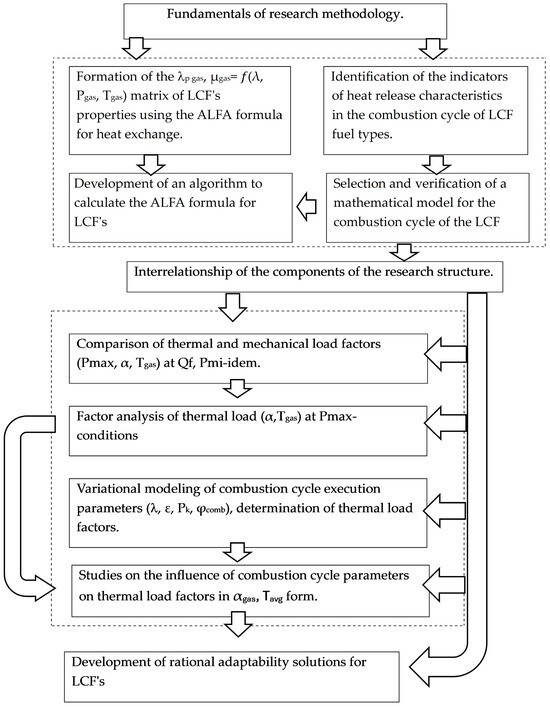 The component ri values are determined based on the chemical oxidation equations of the fuel types. The structural element of the ALFA formula, , formed from the physical parameters of the combustion material, λp gas and μgas, reveals the impact of the working fluid’s composition (due to the different chemical compositions of LCF types) on the intensity of heat. The ALFA (α) formula applied in this study can be used in two parallel methods for practical implementation: calculating its instantaneous values during the cycle or using the average thermodynamic parameters of the working body, Pavg and Tavg. The decarbonization research was based on the second approach.