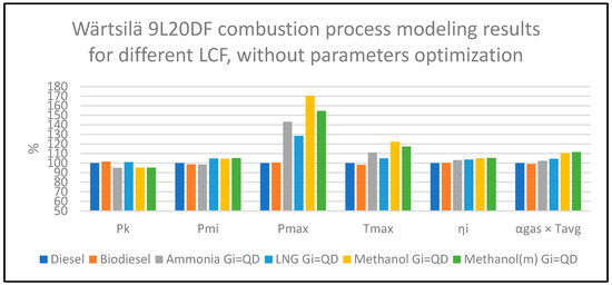 Natural Gas. The Wärtsilä 9L20DF engine is designed to operate on both diesel and LNG, with some data provided in the engine’s technical specifications. Although it is noted in [19] that the engine operates with a reduced λ of 2.1–2.3 in LNG mode (compared to λ = 2.5 for diesel), the modeling for the first phase of this study was performed with λ = 2.5. An increase in λ to 2.5 from the optimal level was associated with increases in all evaluated parameters: Pmax by 28%, and thermal load on components by 4% (from a practical standpoint, changes in Pmi and ƞi are not significant). This significant increase in Pmax requires reducing Pmax and also managing thermal stresses.