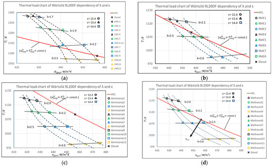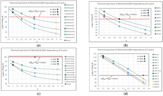 Reducing the thermal load factor potential of the Wärtsilä 9L20DF engine by optimizing the λ-ε parameters: (a) LNG; (b) biodiesel; (c) ammonia; and (d) methanol.