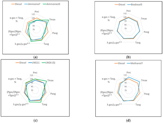 Comparison of thermal load parameter rates on the components of the Wärtsilä 9L20DF engine operating on LCFs (Pmax = idem) versus diesel: (a) ammonia, (b) biodiesel, (c) LNG, and (d) methanol.