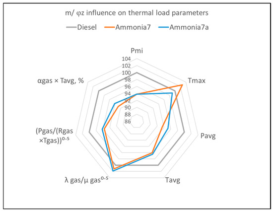 Figure 6 compares different m/φz values for ammonia, confirming that increasing combustion intensity (i.e., reducing combustion duration) not only enhances energy efficiency but also lowers the thermal load on engine components. As shown in the figure, a similar effect can be achieved by increasing the fuel injection pressure, which accelerates the combustion cycle [20,22,35,59,60]. In modern engine designs, rapid and intense fuel combustion is a standard requirement for efficient combustion cycle execution. This principle was notably applied in the development of MTU’s fourth-generation diesel models [58,59]. Although preliminary and requiring further experimental validation, the findings suggest that this approach can further contribute to reducing the thermal load on engine components.