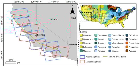 The study area encompasses the Pacific coastline of California, situated in the western United States along a critical tectonic boundary between the North American and Pacific Plates, as depicted in Figure 1. The area exists within one of Earth’s most seismically active regimes, characterized by complex plate boundary interactions that drive sustained crustal deformation. At the heart of this dynamic system lies the San Andreas Fault Zone (SAFZ), a dextral transform boundary accommodating approximately 70–80% of the relative Pacific–North American plate motion through right-lateral strike-slip displacement [29]. This powerful tectonic framework generates multi-scale deformation patterns: localized fault-related displacements superimposed upon regional inter-seismic strain accumulation across the plate boundary. The complex interplay of these geodynamic processes creates spatially variable vertical motions measurable at millimeter-to-centimeter scales, making the region an ideal natural laboratory for studying tectonic geomorphology and crustal deformation mechanisms.