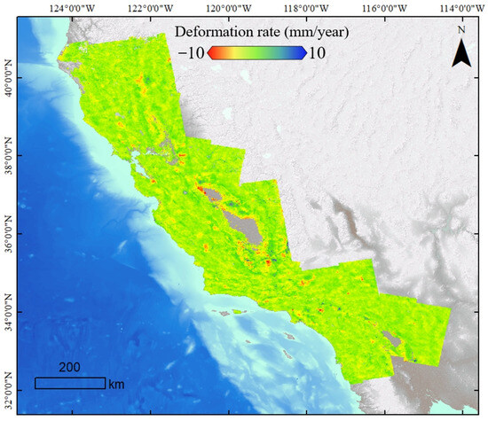 In recent years, the issue of surface deformation in the western coastal region of California has garnered widespread concern. This area experiences dual pressure from human-induced factors (e.g., urban development and groundwater pumping) and natural processes including tectonic activity and rising sea levels. These deformations not only disrupt community livelihoods but also endanger infrastructure and ecological stability. Alarmingly, estimates indicate that 4.3–8.7 million coastal residents in California are vulnerable to subsidence [12]. As such, the accurate and timely monitoring and early warning of surface deformation in this region are paramount in safeguarding human lives, property, and the sustainable socio-economic development of the region.