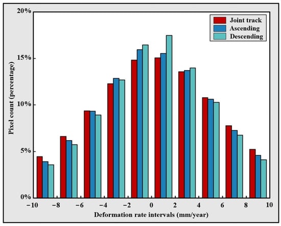 To evaluate the effectiveness of the joint track method, we benchmarked it against single-track results from ascending and descending orbit measurements. To accomplish this, we projected the single orbit results onto the vertical direction using Equation (4) and compiled histograms of the deformation rate distributions for all three cases, presented in Figure 5. Given the large-scale study area encompassing multiple Sentinel-1 frames and merged sampling points, the deformation distributions of all three methods exhibit a clear normal distribution pattern. Notably, joint track results demonstrated smoother distribution curves. It is noteworthy that the peaks of the ascending and descending track histograms occur on opposite sides of the zero line. Specifically, the ascending track peak is negative, while the descending track peak is positive. This discrepancy is attributed to the distinct flight directions and observation angles adopted by the radar satellites during ascending and descending flights. However, as our analysis relies primarily on pseudo-deformations calculated directly from the formula, we primarily focus on the joint track results. According to the joint track results, 52.4% of the study area experiences positive deformation, while 47.6% undergoes negative deformation. A closer examination reveals that most areas maintain relatively stable ground conditions, with minor deformations concentrated between ±4 mm/year, accounting for 55.8% of the total area. However, it is crucial to highlight that 9.7% of the regions exhibit absolute deformation rates exceeding 8 mm/year. These areas merit particular attention and require continuous monitoring to mitigate the risk of potential disasters.