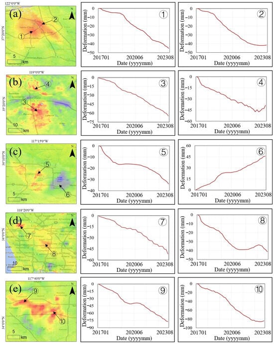 Ground deformation of coastal cities and their deformation history of certain points: (a) San Jose, (b) Bakersfield, (c) San Bernardino, (d) Los Angeles, and (e) Ontario.