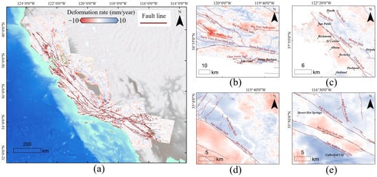 Deformation associated with fault lines (a) (fault lines are delineated based on the U.S. Geological Survey Quaternary fault and fold database) and zoom-ins of certain fault (b–e).