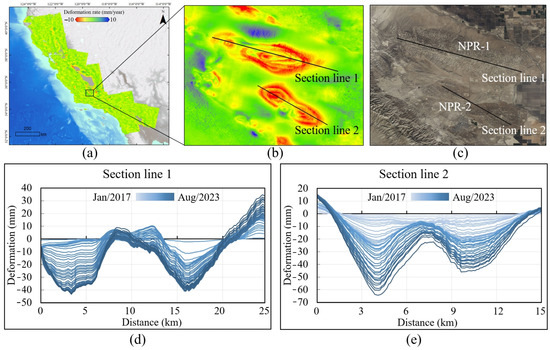 In addition to the fault activities, the InSAR deformation results revealed distinct deformation anomalies resulting from underground resource extraction. As depicted in Figure 9b, two prominent subsidence funnels stand out, clearly indicating mining-induced deformations. These deformations are located within the Elk Hills Naval Petroleum Reserve, an area comprising Naval Petroleum Reserve No.1 (NPR-1) and Naval Petroleum Reserve No.2 (NPR-2), whose optical imagery is shown in Figure 9c. Thick, unconsolidated sedimentary basins exhibit pronounced subsidence from fluid extraction due to their high compressibility. To gain a deeper understanding of the temporal surface deformation in these oil reserves, we selected specific section lines within the subsidence funnels. Section Line 1 traverses NPR-1, spanning 25 km, while Section Line 2 cuts through NPR-2, covering 15 km. By collecting cumulative deformation data at a bi-monthly interval and analyzing these data, we have plotted temporal cumulative deformation curves that comprehensively capture the deformation patterns from January 2017 to August 2023. Each profile location features 40 curves, comprehensively outlining the temporal evolution of cumulative deformation, as illustrated in Figure 9d,e. During the monitoring period, NPR-1 experienced a cumulative subsidence of over 40 mm, while NPR-2 recorded an even more significant cumulative subsidence of more than 65 mm. Despite NPR-1’s visually larger subsidence funnel, NPR-2 exhibited a more pronounced subsidence rate. Intriguingly, we also observed signs of surface uplift in the peripheral regions of the subsidence funnels. These distinct deformation patterns align with the expected geo-mechanical responses to oil extraction, providing valuable insights into the geological implications of such resource extraction activities.