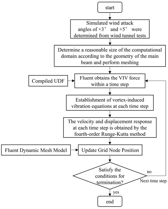 Step 5: Based on the velocity and displacement response calculated in Step 5, update the grid node positions with the dynamic grid model and determine whether the computation stopping condition is met. If it is satisfied, stop the calculation condition; if not, carry out the calculation in the next time step. Cycle according to Steps 3–5 to realize the VIV response analysis of the main girder section.