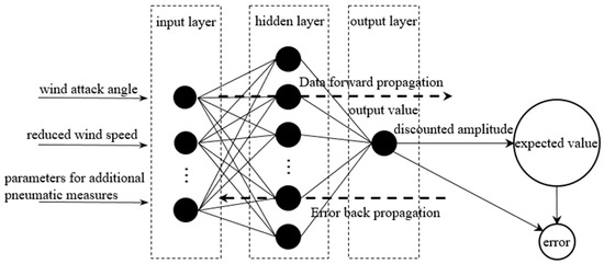 BPNN is a kind of artificial neural network, which has the advantage of being able to approximate any complex nonlinear function and is robust to noise and incomplete data [27,28]. As shown in Figure 3, BPNN is divided into two parts: forward propagation of data and backward propagation of error. Sigmoid and ReLU are used as activation functions in forward propagation. Its working principle is as follows: the input value is propagated forward from the input layer to the output layer through the hidden layer, and the output value is obtained; then, the error between the output value and the expected value is propagated backward through the hidden layer, and the weights in the model are adjusted continuously to reduce the error between the output value and the expected value. Therefore, using BPNN to analyze the VIV response data of the DDST girder is feasible. The parameters of the BPNN network are mainly the number of hidden layers and nodes in hidden layers. We use the Adam Optimizer to optimize BPNN. The learning rate is set to 0.01, the epoch is set to 100, and the model converges when we reach the 19th training epoch.