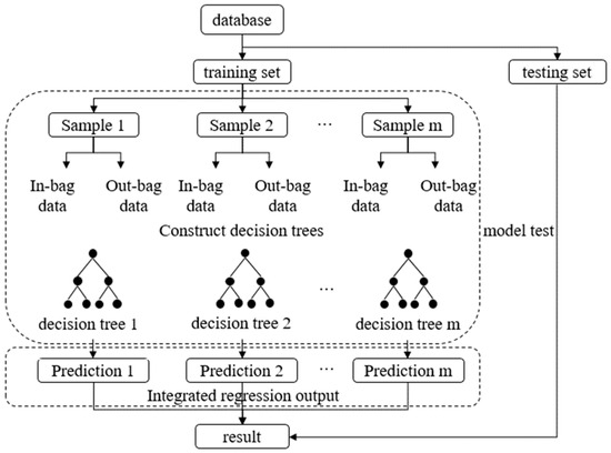 RF is an integrated learning method suitable for classification and regression. RF combines the advantages of decision trees and randomness, has strong data mining ability and high prediction accuracy, and, thus, is widely used to solve prediction class problems [29]. As shown in Figure 4, the use of Random Forest to deal with the regression problem is divided into two parts: One is to construct a decision tree from the training set and put back to randomly extract 2/3 of the samples (bag of data) as a sample set to train the decision tree, segmentation based on random features until the stopping conditions are met, and the remaining 1/3 of the samples (out-of-bag data) are used to evaluate the error, which can be used to obtain a single decision tree model, and a total of extracted and trained m times; then, m decision tree models can be obtained. Second is the integrated regression output, the prediction result of each decision tree, which is averaged as the final result output. The RF network parameters are the number of decision trees (n) and the minimum number of leaves (leaf).