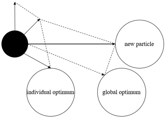 PSO [32,33] is an optimization algorithm based on group intelligence. Its basic idea is to regard the problem’s solution space to be optimized as a swarm of particles in a multidimensional space. Each particle represents a candidate solution, and each particle has its own position and velocity. Each particle updates its own position and velocity according to its own experience and the experience of the group, the principle of which is shown in Figure 6.