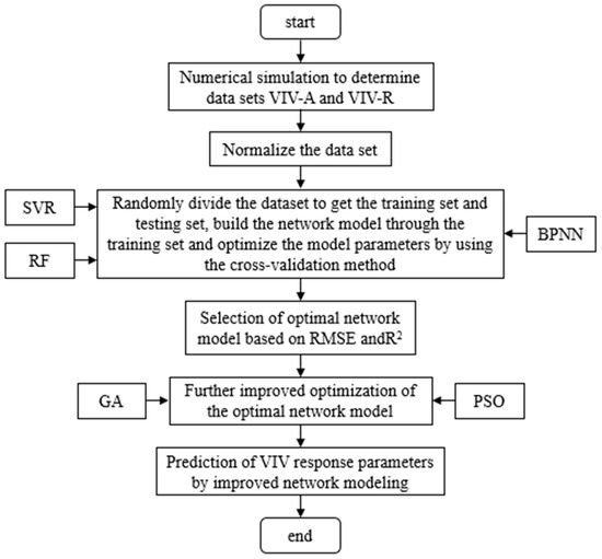 The VIV response analysis method is combined with three common algorithms to establish a prediction model, and the GA and PSO algorithms are further improved to achieve better prediction results. The modeling is shown in Figure 8, and the specific analysis steps are as follows: