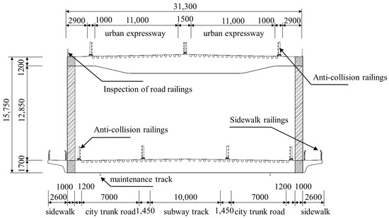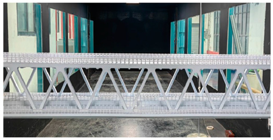 Huangjuetuo Bridge is a large-span dual-purpose suspension bridge for expressways and railroads under construction in China. Except for the web members, the bridge cross-section is almost unchanged along the bridge axis’s direction, and the DDST girder’s standard cross-section is shown in Figure 9. The results of the calculation of structural dynamic characteristics for the bridge’s main modes are shown in Table 1. These parameters will be used as an important basis for the design of a segmental model in the wind tunnel test.