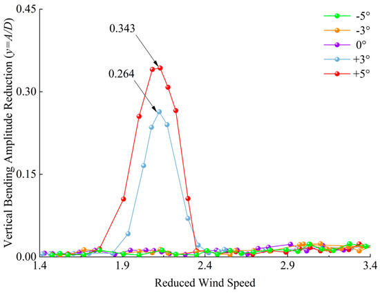 In the uniform flow field, the VIV measurement test is carried out on the DDST girder section under 0°, ±3°, ±5° wind attack angles, and the test wind speed is 0~10 m/s. The vertical amplitude is defined as A, the test wind speed is defined as U, and the test results are dimensionless. The reduced amplitude of the vertical bending VIV is taken as the ratio of the amplitude to the height of the model girder, i.e., y = A/D. The reduced wind speed is taken as the ratio of the test wind speed to the product of the base frequency of the vertical bending of the structure and the height of the model girder, i.e., , where = 2.22 Hz. The test results are shown in Figure 11.