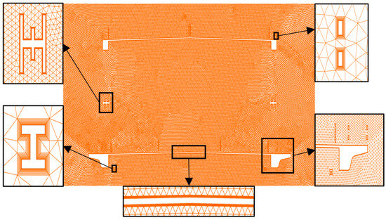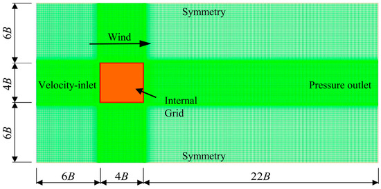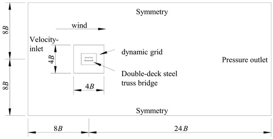 The calculation domain of CFD numerical simulation is divided into two parts: internal region and external region. The external region uses a structured grid, and the internal region uses an unstructured grid. Based on the actual width of the model, B = 0.569 m, the internal area size is 4B × 4B (width × height), and the external area size is 32B × 16B (width × height), as shown in Figure 12. The two-dimensional model of the double-deck steel truss girder section is arranged in the middle of the calculation domain, with an entrance distance of 8B, exit distance of 24B, and upper- and lower-boundary distances of 8B, respectively. The blocking rate of the model in the calculation domain is 0.5%, which is less than the allowable value of 5%, which can avoid the influence of the wake reflux.