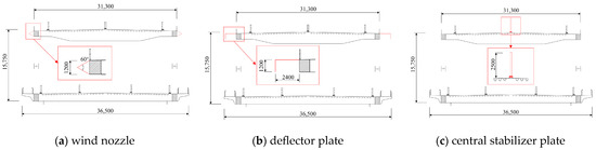 Additional aerodynamic measures to control VIV in bridges are based on the principle of adding additional structures to change the aerodynamic profile of the main girder to improve its aerodynamic performance [13,14,15]. These additional structures include wind nozzles, deflector plates, and stabilizer plates. Zhan et al. [16] analyzed the VIV mechanism and control method for long-span bridges and found that modifying straight railings to wavy railings can effectively suppress vertical and torsional VIV. Yang et al. [17] analyzed the influence of a fully enclosed enclosure structure on the VIV performance of a DDST bridge using a combination of wind tunnel testing and a numerical calculation method.