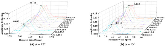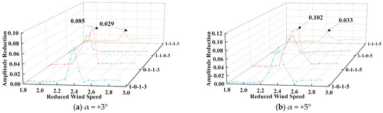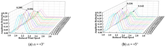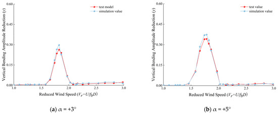 Before performing numerical simulation, its accuracy needs to be verified [35]. The UDF program is activated during the numerical simulation to simultaneously solve for the reduction amplitude of the vertical bending VIV in the DDST girder section, and the calculated results are compared with the wind tunnel test results, as shown in Figure 16.