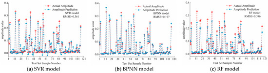 For the amplitude prediction of the DDST girder section under different wind speeds, the wind angle, reduced wind speed, upper chord wind nozzle angle, upper chord wind nozzle tip position, belly bar deflector plate height ratio, lower chord deflector plate height ratio, and central stabilizer plate height are used as feature inputs. The vertical bending reduced amplitude is used as the output. The dataset used for the amplitude prediction of the DDST girder section is defined as VIV-A. To compare the prediction effects of the three models, the VIV-A dataset was divided into training and test sets according to 9:1. The model parameters were set according to the parameters when the minimum RMSE was obtained under 10-fold cross-validation. The amplitude prediction results are shown in Figure 21, and a comparison between the predicted and actual values of amplitude is shown in Figure 22.