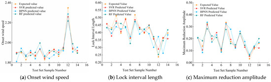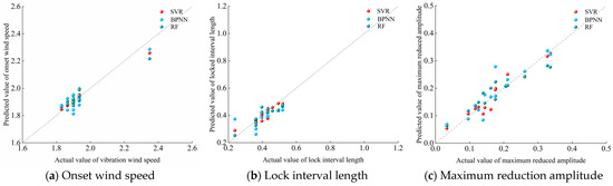 The predictions of the VIV characteristic parameters of the SVR model are all concentrated on the reference line, and most of the predictions of the VIV characteristic parameters of the BPNN and RF models are close to the reference line. The SVR model has higher credibility for the prediction of VIV characteristic parameters, and the BPNN and RF models have some credibility. The R2 of the prediction of VIV characteristic parameters of the SVR model is the largest, at 0.9398, 0.8520, and 0.9299, respectively. Therefore, in the case of a small sample size of the additional aerodynamic measures condition, the SVR model has the best prediction of the onset wind speed of the VIV of the DDST girder section, locking interval length, and maximum reduction amplitude.