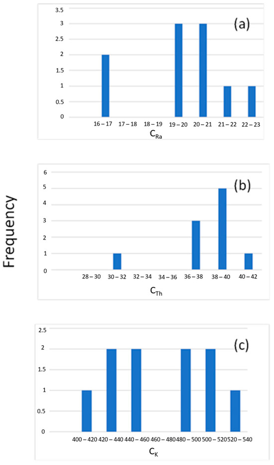 Frequency distributions of 226Ra (a), 232Th (b), and 40K (c) activity concentrations.