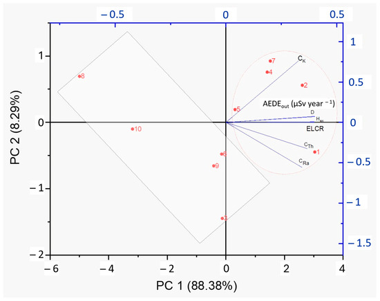 The obtained PCA biplot is reported in Figure 4. The variable “Site IDs” was also inserted, in an attempt to evaluate the possibility of regrouping for those samples that demonstrate homogeneous behavior in terms of activity concentrations and radiological characteristics.