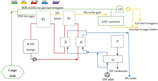 Simplified scheme of the closed-loop regasification system integrated on the FSRU vessel. LNG—liquefied natural gas; NG—natural gas; R-290—propane loop; SW—sea water loop; Steam—water in steam phase loop; LD—low-duty compressor; R1—LNG regas vaporizer; R2—NG trim heater; E1—R290 pre-heater; E2—R290 evaporator; S1—SW steam from regas boilers; S2—sea water heater.