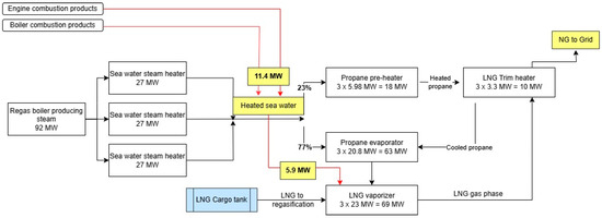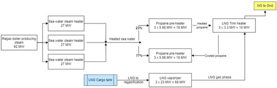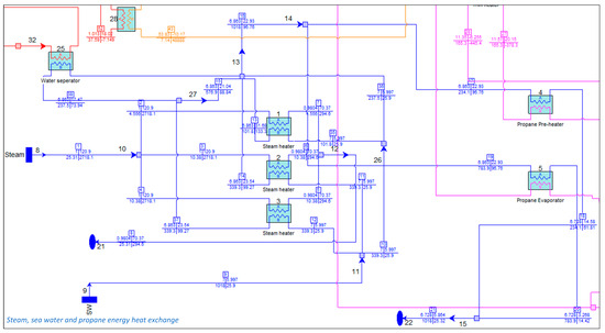 The structure of the mathematical model includes three main blocks of energy exchange in the form of heat (Equation (6)). In the equations, dU is an expression of energy change per elementary time. Uboiler—steam energy flowing to sea water heat exchanger; UW—sea water energy flowing to sea water heat exchanger; Upropane—propane energy flow to propane heat exchangers; ULNG—LNG energy flow to vaporizer.