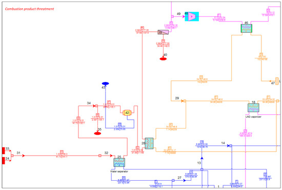 To evaluate full system compatibility and potential retrofit of the system, Thermoflow Thermoflex 32 software is used for evaluation which enables the parameters to be verified. This software is a tool widely used in industrial and maritime applications, particularly for thermal process simulation, energy efficiency analysis, and verification of system optimization. The application is widely used in LNG terminals, power plants, and ship propulsion systems allowing estimation of the performance of heat exchangers, compressors and fuel systems [28]. The result of the mathematical modelling, based on the principle of CCC technology as outlined in Figure 3, was realised on the basis of the Thermoflow infrastructure.